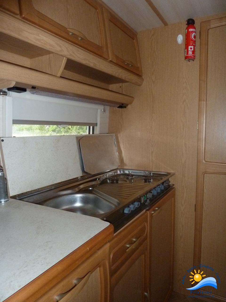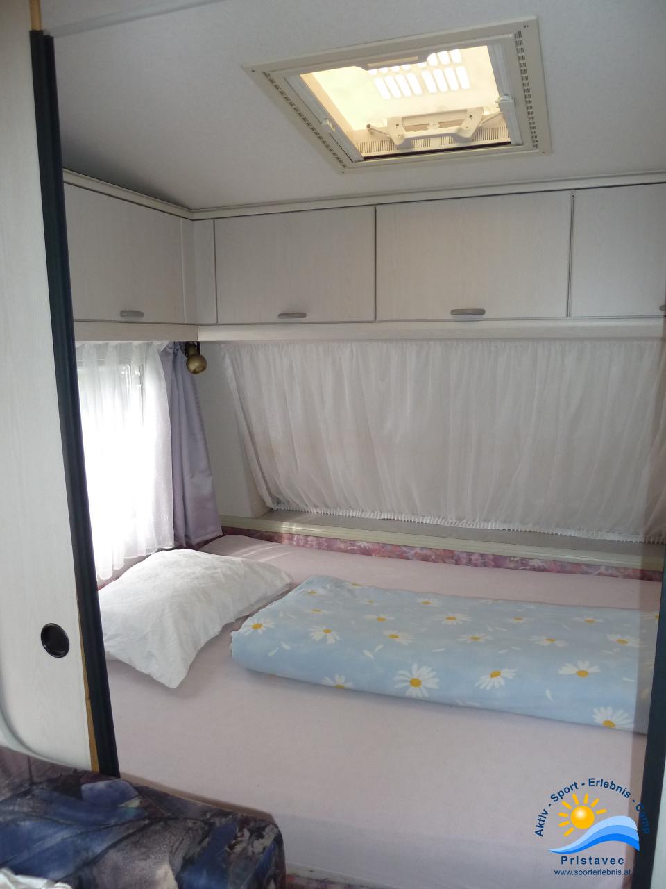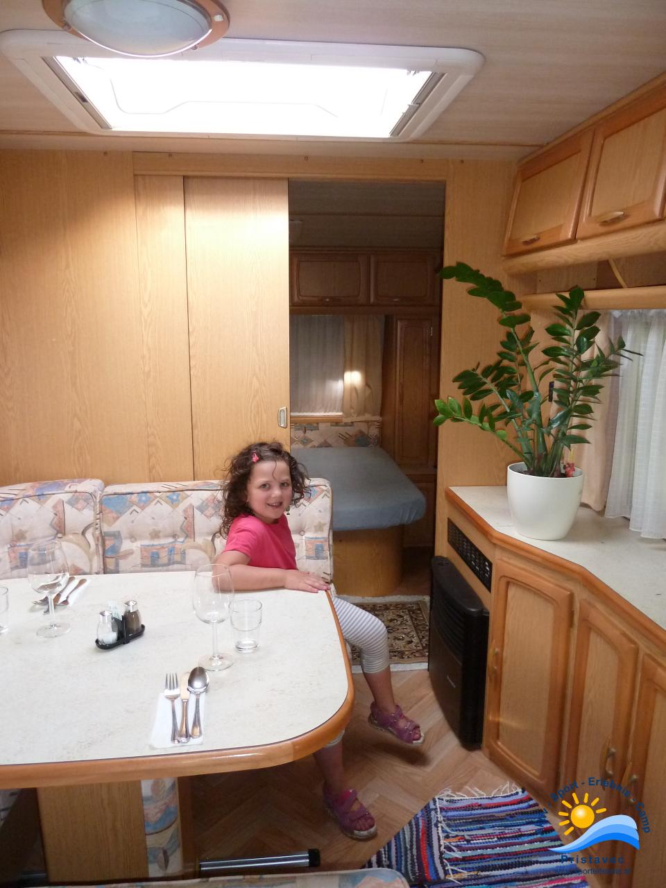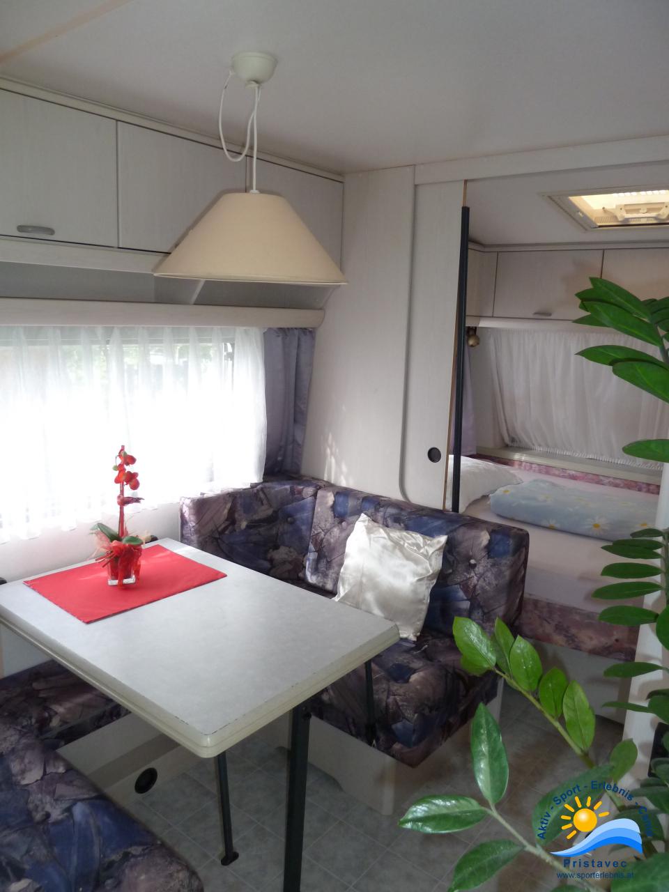 Der Wohnwagen bietet Schlafplätze für 2 Erwachsene und 2 Kinder kleine Küche.